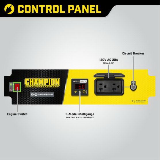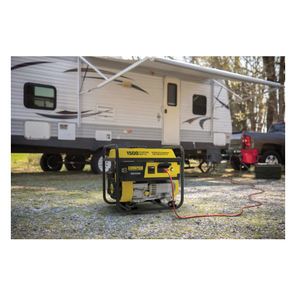 The Champion Power Equipment 200915 1200 W multi-purpose portable generator is designed with your safety and convenience in mind and is the ideal what if generator. At 1500 W starting and 1200 W running, this rugged generator with its durable steel frame is easy to transport and provides just what you need for RV use, camping, tailgating, boating, hunting, weekend trips, family vacations and small jobs around the house. The next time there's an outage, the 79 cc Champion single cylinder OHV engine will provide the power you need for a few essential items in an emergency lights, microwave, fan, TV, modem/router, cell phone charger and more. (Note: this unit is not recommended for emergency home backup for powering air conditioners, stoves, furnaces or sump pumps). Power up with Champion's reliable recoil start, plus cold start technology ensures a quick start in cold weather. Champion also makes it easy to monitor voltage, frequency and operating hours with Intelli gauge. This unit includes two 120 V 20 A covered household outlets (5-20R). Designed for safety with convenient push to reset circuit breakers, a low oil shut-off sensor plus an included oil funnel for easy changes, this unit has a 0.4 qt oil capacity (recommended 10W-30). The reliable 80 cc single cylinder OHV Champion engine produces 1500 W starting and 1200 W running and will run for up to 10 hr at 50% load when the 1.5 gal tank of gasoline is full. With a noise level of 65 dBA from 23 ft, which is a little bit louder than normal speech, this machine can handle a few basic essentials in an outage. Champion's thoughtful packaging and clear directions make setup hassle free.