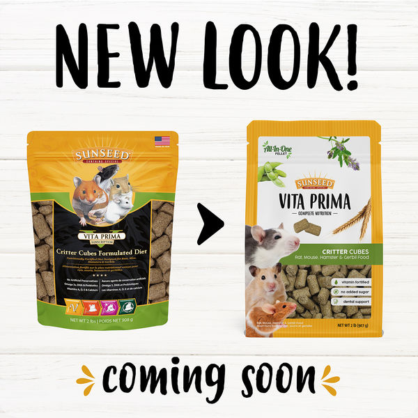 Nutritionally fortified, complete pelleted diet for mice, rats, hamsters and gerbils. Vita Prima critter cubes are an easy-to-serve food enriched with vitamins and minerals. The pellet formula is ideal for preventing selective eating and food waste common to pets that hoard food around their habitats, with a crunchy texture that helps provide healthy wear on always-growing teeth. Critter cubes also make a great supplemental treat for other larger small pets.