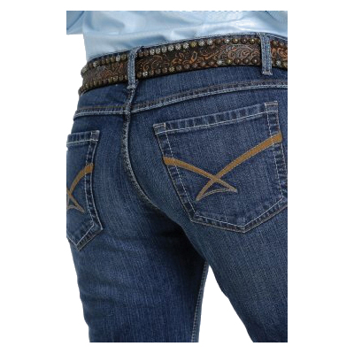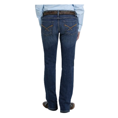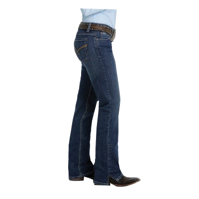 The dark stonewash Kylie is performance ready, constructed of form-fitting stretch denim, complemented with whiskers and is graced with a simple, camel-colored signature stitch on the back pockets. The kick slit at the leg opening allows this jean to stack ideally on top of boots.