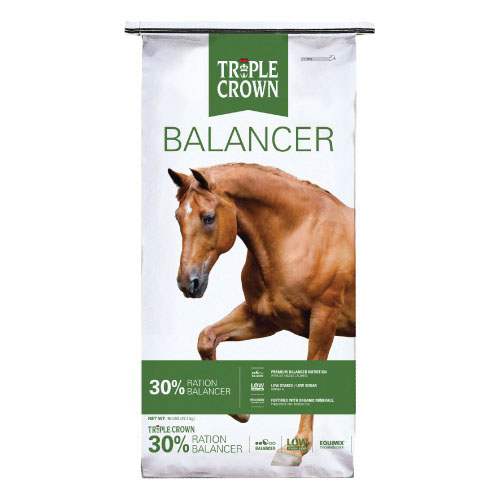 A super premium pelleted mineral and vitamin supplement for all horses. Ideal for horses not needing additional calories other than supplied by forage, horses receiving less than minimum recommended amounts of feed, horses fed plain grain such as oats, horses with metabolic syndrome, broodmares, growing horses, ponies and miniature horses. Triple Crown 30% ration balancer is designed for many uses. Used by owners who prefer to feed their horses grains and/or forage products, but want all the benefits of Triple Crown's EquiMix® and revolutionary formula. Use to boost nutrient content in the diet if you are feeding a product below recommendations. This pelleted supplement is specifically formulated for growing horses and broodmares, as well as horses with metabolic issues, performance horses that need quality protein and easy keepers that require a balance of vitamins and minerals.