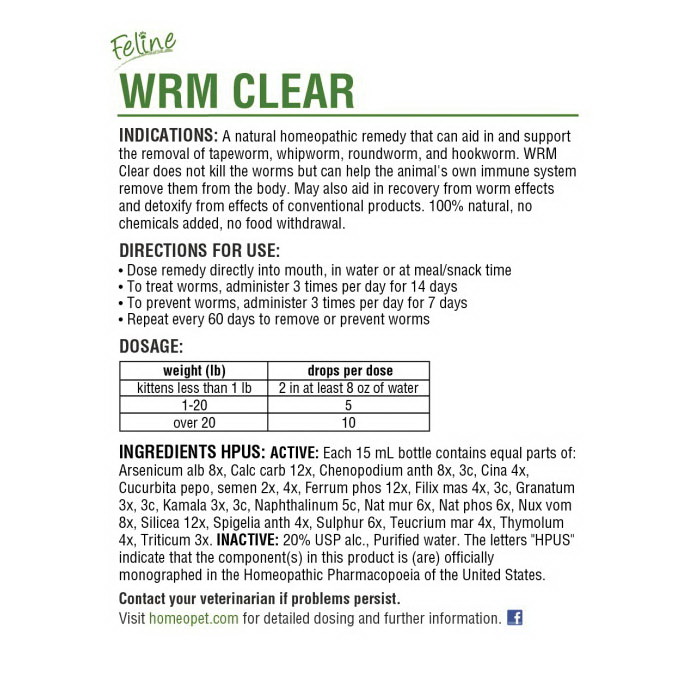 Can aid in and support the removal of tapeworm, whipworm, roundworm and hookworm in cats. WRM clear does not kill the worms but can help the animal's own immune system remove them from the body. May also aid in recovery from worm effects and detoxify from effects of conventional products. 100% natural, no chemicals added, no food withdrawal.