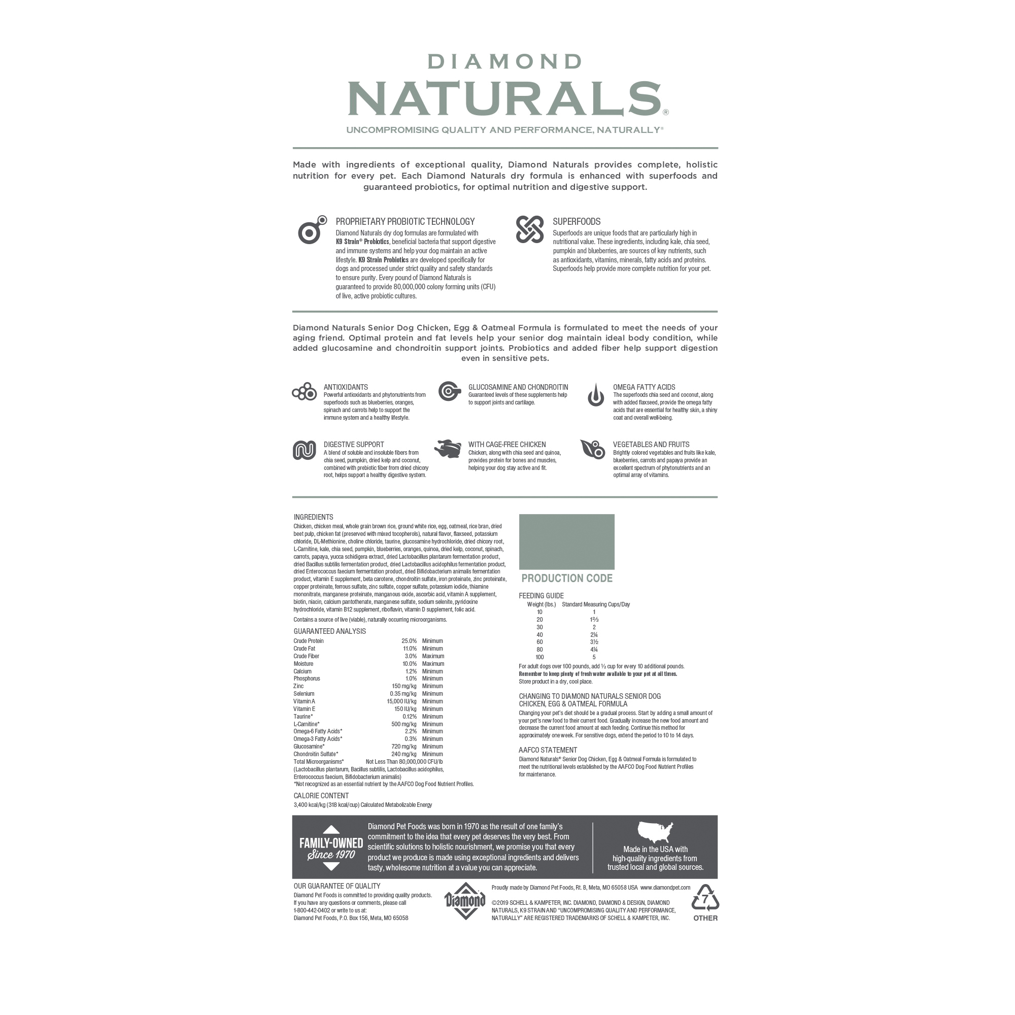 Diamond Naturals Dog Food, Chicken, Egg, Oatmeal Formula Flavor, 35 lb Net Content, Ingredients: Chicken, Chicken Meal, Whole Grain Brown Rice, Ground White Rice, Egg, Oatmeal, Rice Bran, Dried Beet Pulp, Chicken Fat (Preserved With Mixed Tocopherols), Natural Flavor, Flaxseed, Potassium Chloride, Dl-methionine, Choline Chloride, Taurine, Glucosamine Hydrochloride, Dried Chicory Root, L-carnitine, Kale, Chia Seed, Pumpkin, Blueberries, Oranges, Quinoa, Dried Kelp, Coconut, Spinach, Carrots, Papaya, Yucca Schidigera Extract, Dried Lactobacillus Plantarum Fermentation Product, Dried Bacillus Subtilis Fermentation Product, Dried Lactobacillus Acidophilus Fermentation Product, Dried Enterococcus Faecium Fermentation Product, Dried Bifidobacterium Animalis Fermentation Product, Vitamin E Supplement, Beta Carotene, Chondroitin Sulfate, Iron Proteinate, Zinc Proteinate, Copper Proteinate, Ferrous Sulfate, Zinc Sulfate, Copper Sulfate, Potassium Iodide, Thiamine Mononitrate, Manganese Proteinate, Manganous Oxide, Ascorbic Acid, Vitamin A Supplement, Biotin, Niacin, Calcium Pantothenate, Manganese Sulfate, Sodium Selenite, Pyridoxine Hydrochloride, Vitamin B12 Supplement, Riboflavin, Vitamin D Supplement, Folic Acid, Contains A Source Of Live (Viable), Naturally Occurring Microorganism, Nutritional Information: 25% Crude Protein, 11% Crude Fat, 3% Crude Fiber, 10% Moisture, 1.2% Calcium, 1% Phosphorus, 150 mg/kg Zinc, 0.35 mg/kg Selenium, 15,000 IU/kg Vitamin A, 150 IU/kg Vitamin E, 0.12% Taurine, 500 mg/kg L-Carnitine, 2.2% Omega-6 Fatty Acids, 0.3% Omega-3 Fatty Acids, 720 mg/kg Glucosamine, 240 mg/kg Chondroitin Sulfate, Not Less Than 80000000 CFU/lb Total Microorganisms, 3400 kcal/kg (318 kcal/cup) Calculated Metabolizable Energy