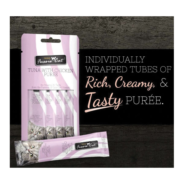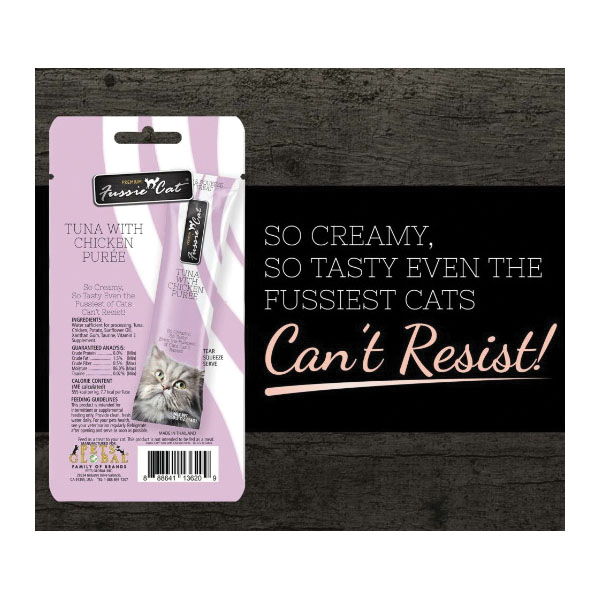 Fussie Cat tuna with chicken puree is love at first lick. Creamy in texture and rich in taste, this indulgent, flavorsome puree will make even the fussiest of cats demand more. Fussie Cat tuna with chicken puree is an easy to feed cat treat with essential vitamin E for your cat's diet to support healthy skin and coat. Fussie Cat's secret to a purr-fect puree is that we always use carefully sourced, simple and wholesome ingredients. Not only delicious but also full of nutritious vitamins and minerals, making it an ideal addition to your cat's everyday diet. Available in twenty tasty varieties, Fussie Cat purees are high-in the moisture your feline friend needs for a healthy and active life. Add it as a topper to make mealtime exciting and flavorful or serve it straight out of the tube as a delicious paw-some snack.