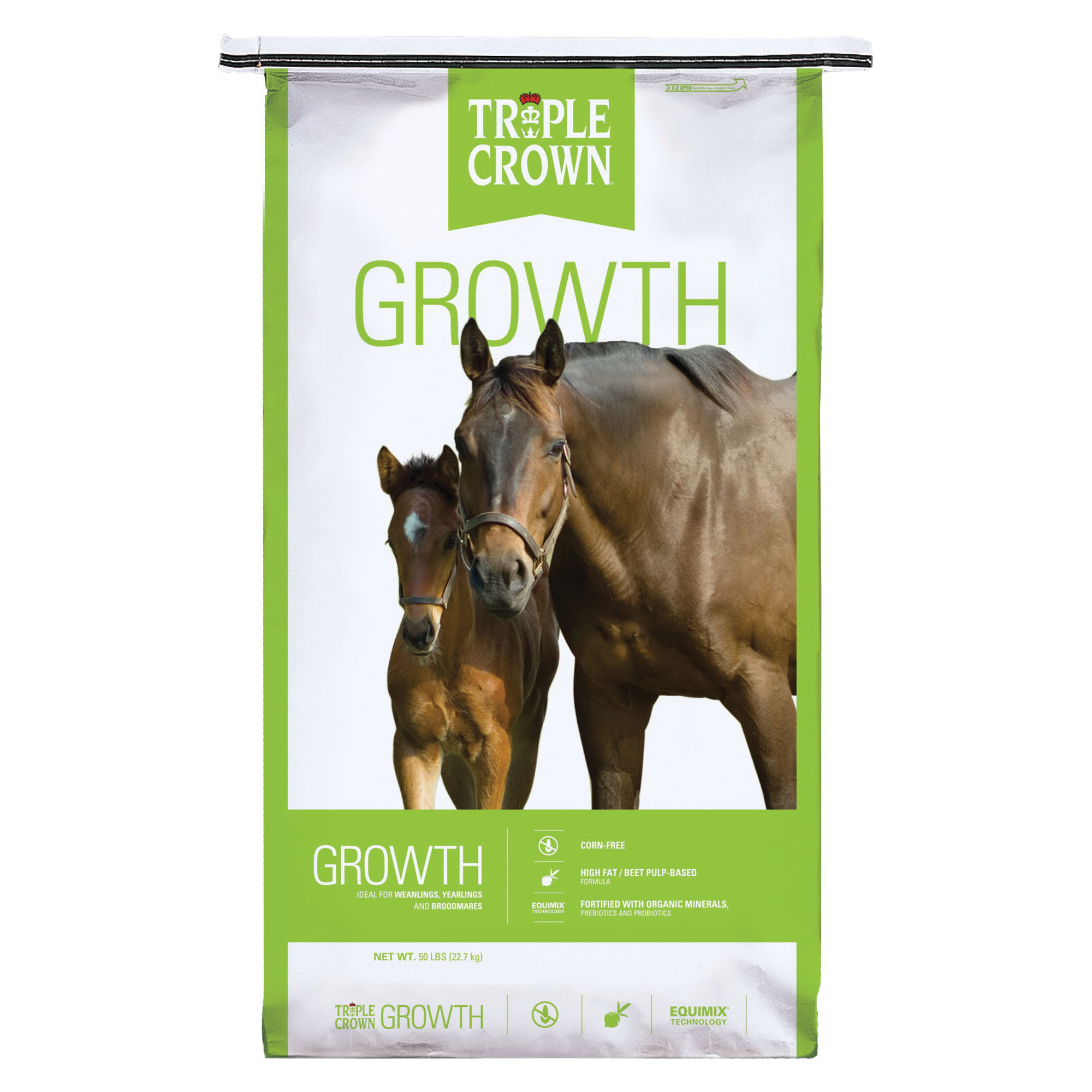 A moderate soluble carbohydrate, high fat, high fiber, beet pulp-based feed. ideal for weanlings, yearlings, broodmares and breeding stallions. Triple Crown Growth is fortified to provide essential amino acids, vitamins, minerals, probiotics, enzymes and proteins essential to equine growth. Utilizing the latest research regarding nutritional support for growing horses, Triple Crown Growth provides more calories through quality fiber and fat, reducing the need for elevated levels of carbohydrates, which helps your horse experience a more consistent growth pattern and healthier joints throughout its life.