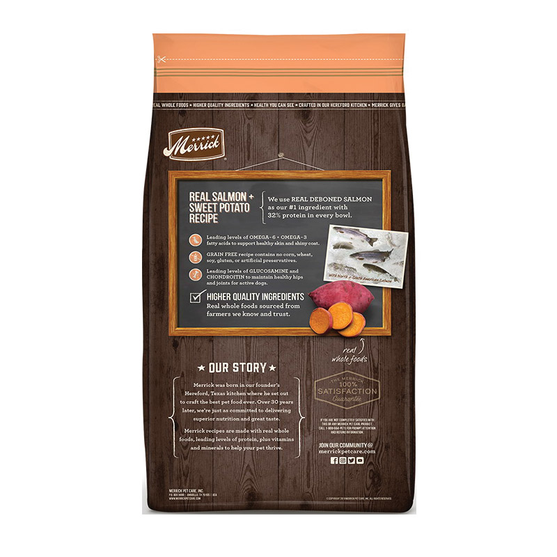 Merrick grain-free real salmon plus sweet potato recipe dry dog food provides balanced nutrition with real whole foods sourced from local farmers we know and trust. This natural, grain-free formula dog food is ideal for all breeds and sizes of dogs with a focus on naturally nutrient rich ingredients to support overall health.