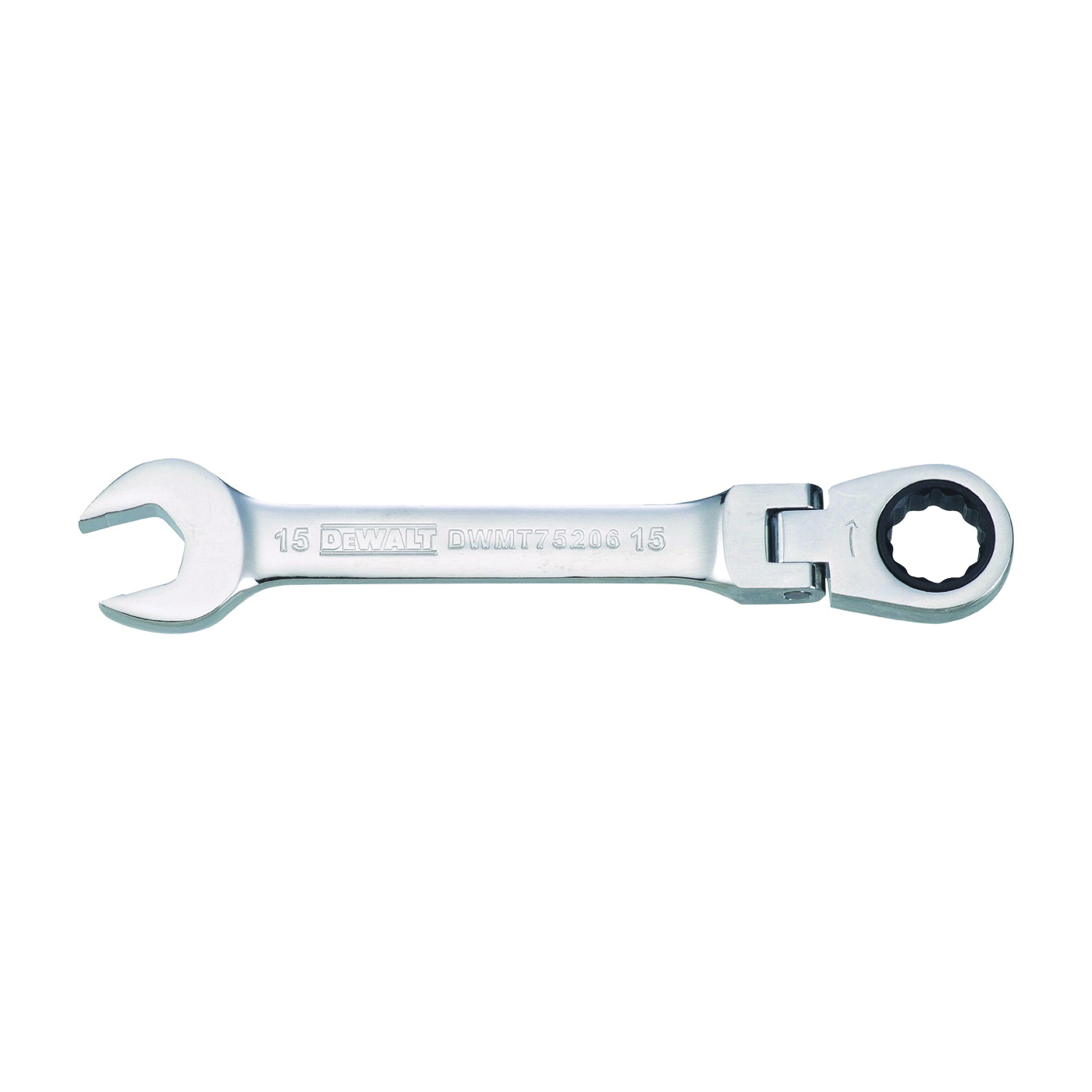 The flex head ratcheting combination wrench has a 15 deg offset open end for increased range of arc swing in tight spaces. The wrench has DirectTorque technology to help prevent rounding of fasteners. The wrench also has stamped hashmarks on the handle for added gripping points.