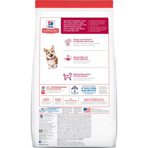 Hill's® Science Diet® small bites adult dry dog food is specially formulated to fuel the energy needs of dogs during the prime of their life. Delicious chicken flavor for those that prefer variety and made with high quality, easy-to-digest ingredients in a small bite size.