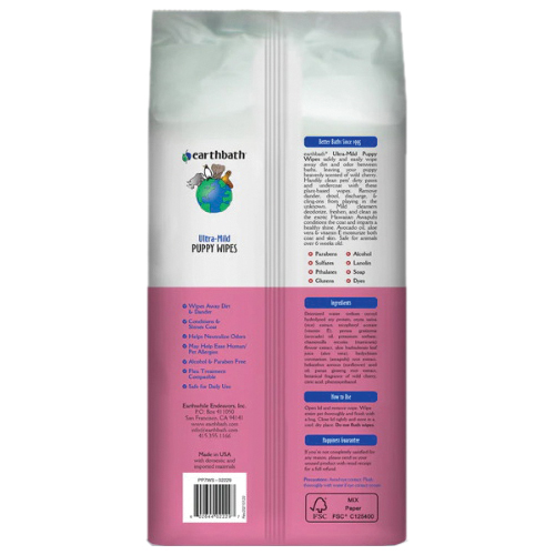 earthbath® ultra-mild puppy wipes safely and easily wipe away dirt and odor between baths. Handily clean puppies dirty paws and undercoat with these plant-based wipes. Mild cleansers deodorize, freshen and clean as the exotic Hawaiian Awapuhi conditions the coat and imparts a healthy shine. Aloe vera and vitamin E moisturize both coat and skin. Safe for daily use on puppies over six weeks old.