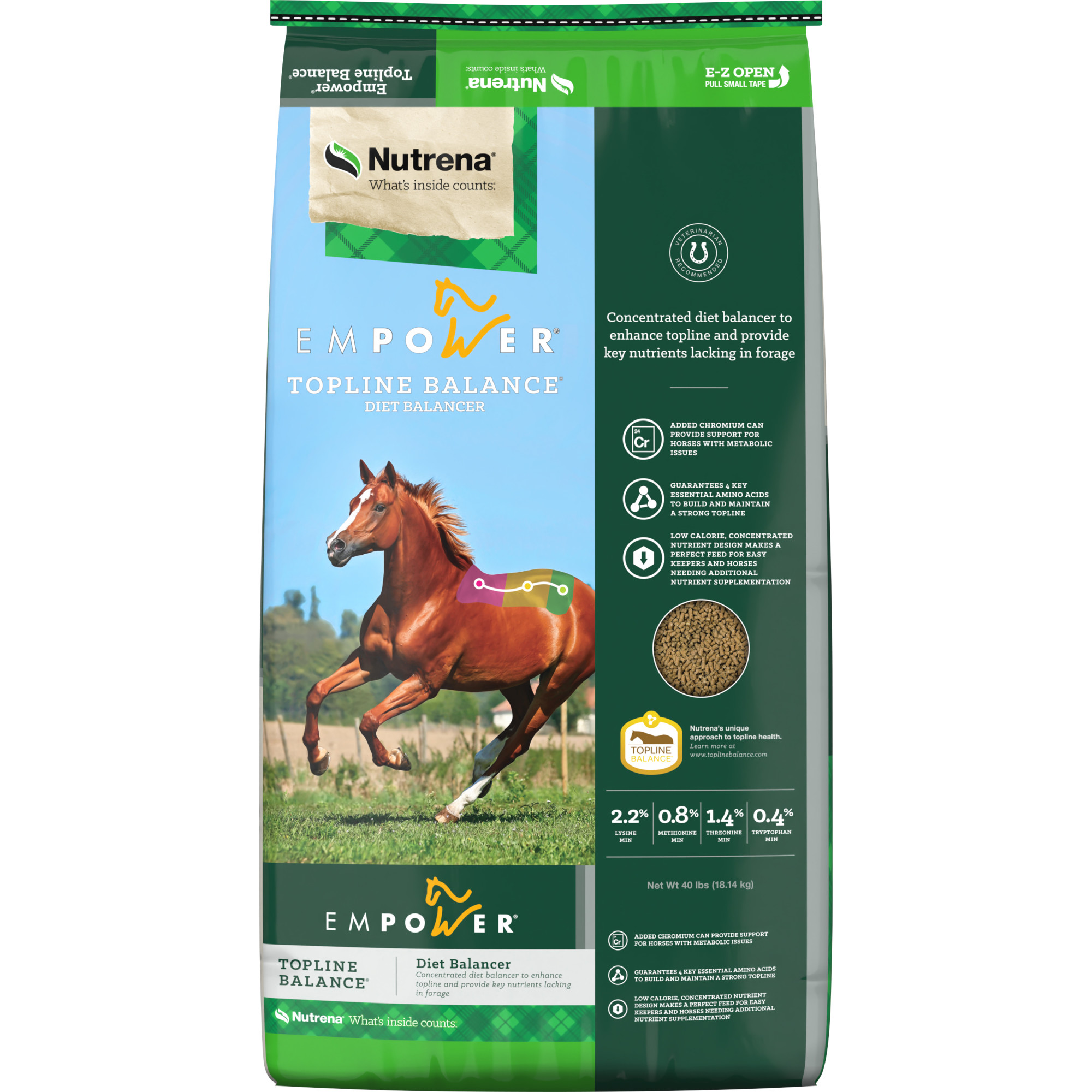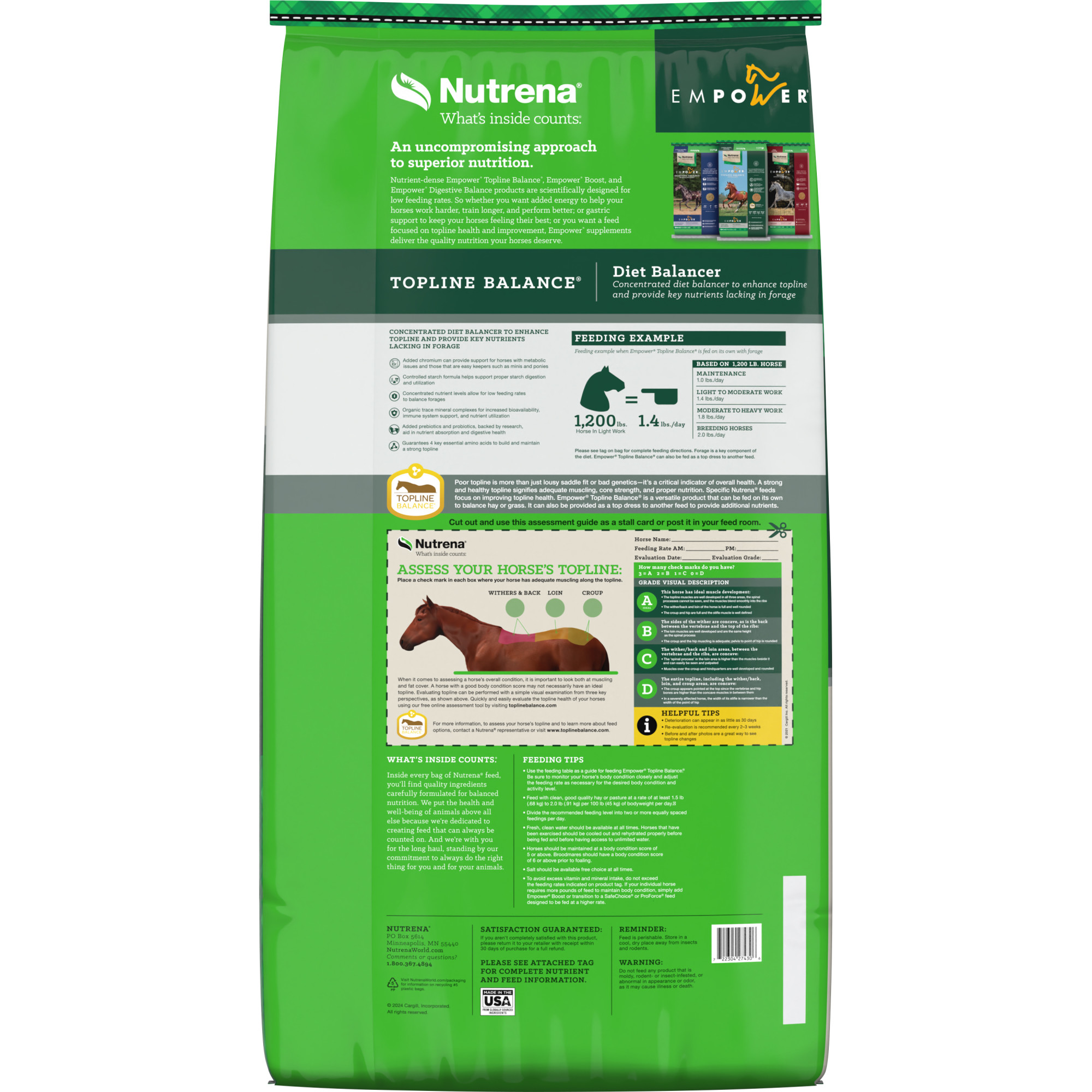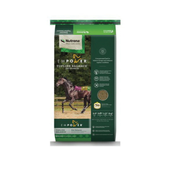 Empower® Topline Balance™ Horse Feed is designed to round out nutrition for your horses that get adequate energy from good quality forage or pasture. It’s a ration balancer offering a blend of the essential amino acids, vitamins, and minerals your horse needs to look and feel its best, including unique support for better topline health. The low-feeding rate is a great benefit, making it the perfect partner with pasture or hay, or as a top dress to another feed.