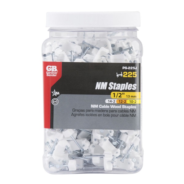 These polyethylene staples with zinc-plated nails are designed to offer fast and easy installation when securing most types of non-metallic cables. The zinc-plated nails not only resist rust and corrosion but drive together for fast installation with a hammer while the recessed heads ensure minimum exposure and avoid snags. The smooth polyethylene saddle protects wire and will not rust, rot or deteriorate. Use to attach all NM cable to joists, framing and other wood installations.