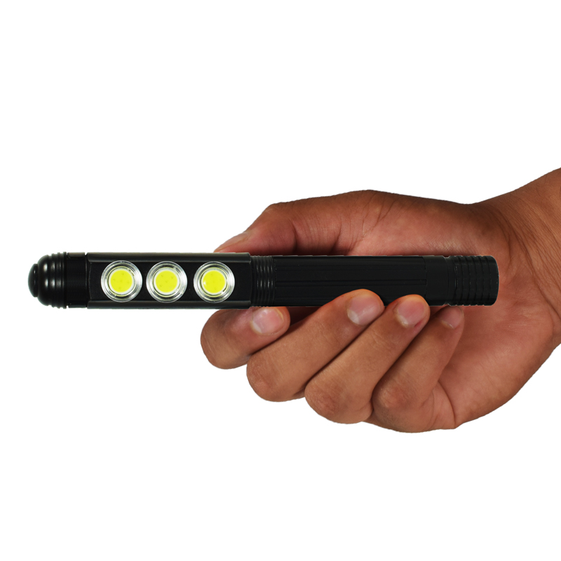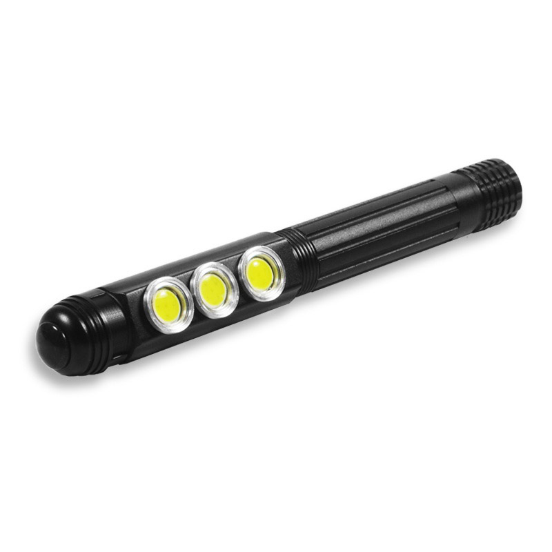 The trifecta is a powerful magnetic pen light. Featuring the latest Chip on Board Technology (COB), the Trifecta features three ultra-bright lights that shine 200 Lumens, boasting a 120 deg broad beam view. The magnetic base makes it perfect for hands-free activities. With a convenient belt clip for easy carry, the Trifecta is powered by three AAA police security batteries.
