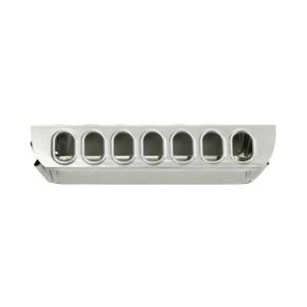 Classic feeder for adult chickens and other birds, with 14 feeding holes (7 on each side). Covered top helps keep debris out of the feed, while individual holes minimize waste. Top slides off for easy filling and cleaning. Made of heavy-gauge galvanized steel for years of service, with rolled edges for safety. Measures 12-1/2 in L by 3-7/8 in W by 2-3/4 in H.
