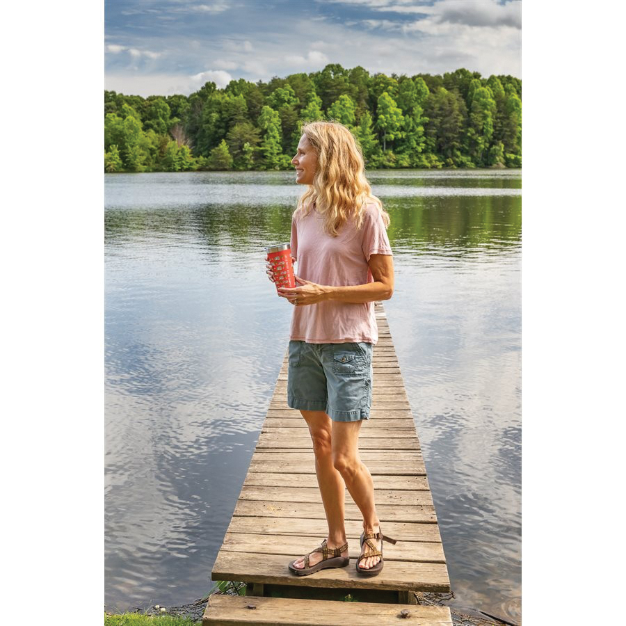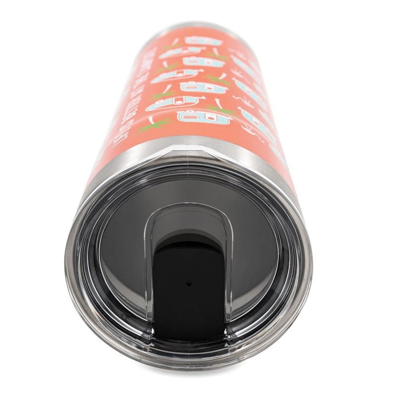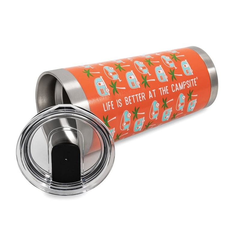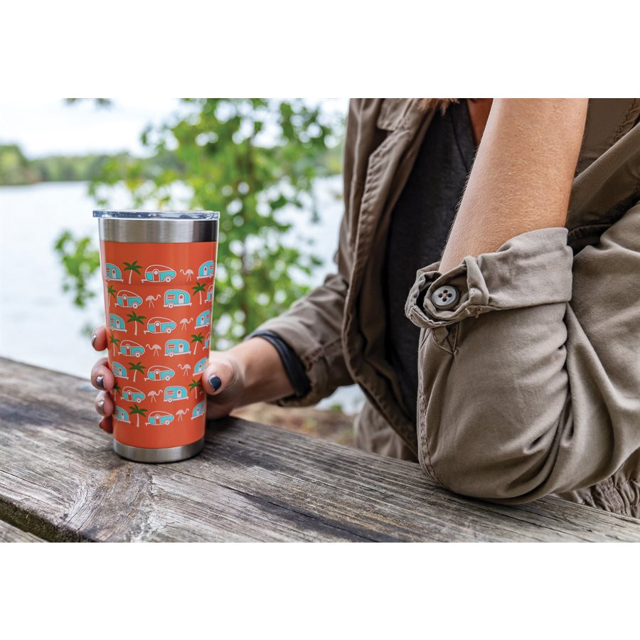 The life is better at the campsite printed tumblers offer great heat and ice retention. They are constructed of durable, kitchen-grade 18/8 stainless steel and come with a BPA-free lid. The double-wall vacuum insulation and built-in gasket help prevent heat transfer, meaning your ice stays solid longer and your cup won't sweat. Features a unique palm tree and RV pattern on a pink background. Fits in most cup holders.