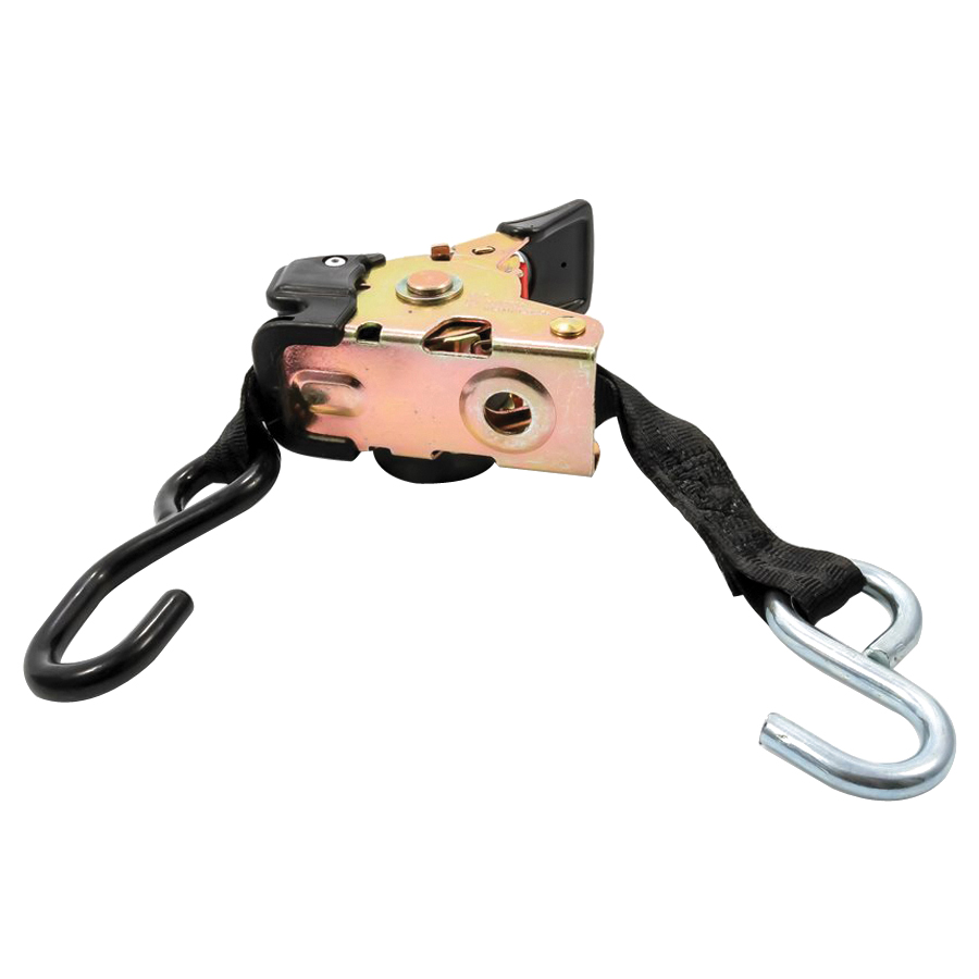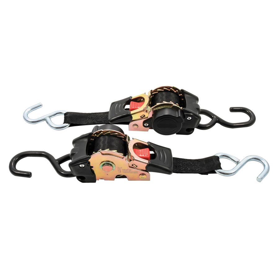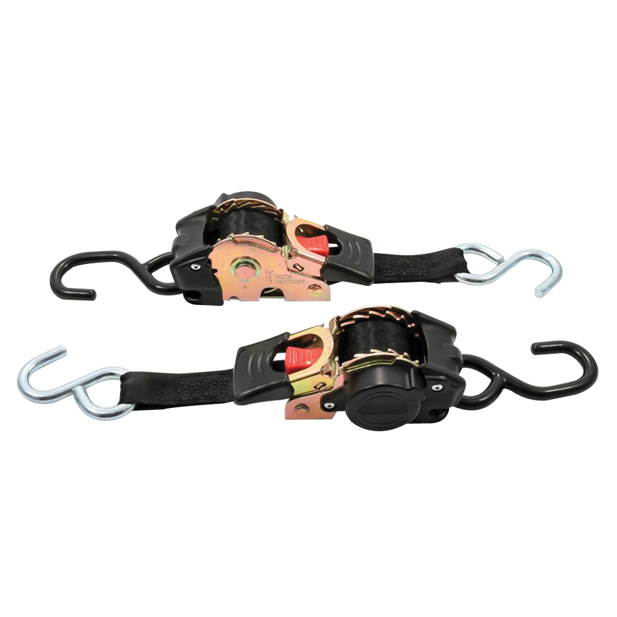Camco's retractable transom tie down straps are essential for hauling and transporting. They support and safely secure boats, motorcycles, ATVs, furniture, cargo, equipment, machinery and more. These retractable straps have a convenient ratcheting mechanism and feature easy to use hooks on each end. A bolt-on design allows you to mount the straps directly to your trailer. They are made of durable polyester webbing and measure 6 ft L x 1 in W. The straps have a break strength of 1500 lb and a safe working load of 500 lb.