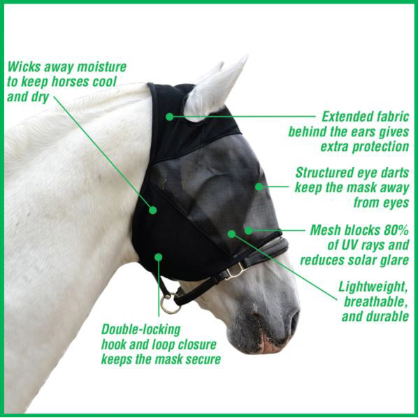 The new standard for protection and comfort, our horse fly mask design keeps horses cool, dry and comfortable using high-tech fabrics originally developed for human performance clothing. It's designed to stay put with two way controlled stretch fabric on the crown and jowl, extended fabric behind the ears and a strong double locking hook and loop closure featuring wider Velcro. It's also designed to protect, with structured eye darts and a mesh that blocks 80% of UV rays. Plus, rolled inner seams prevent rubs and irritation. Assured to last through one fly season. Horse size without ear coverage and size with removable nose canister.