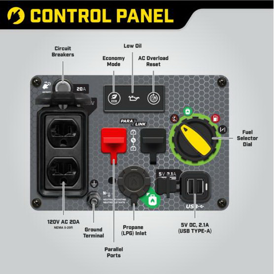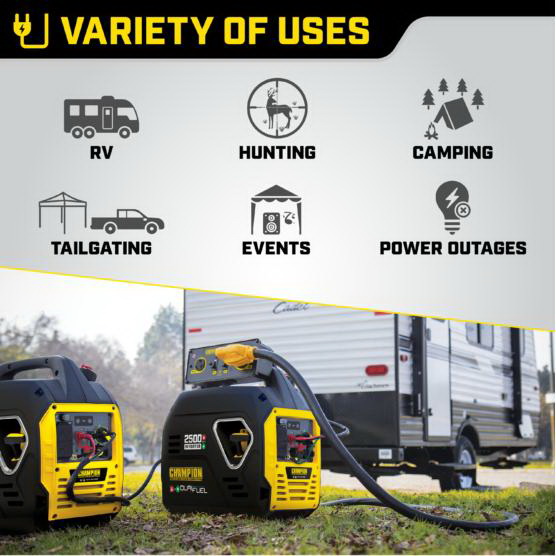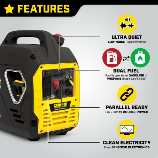 The Champion Power Equipment 200962 2500 W portable inverter generator is ideal for camping or tailgating. Weighing in at an ultralight 39 lb, this model is one of the lightest 2500 W inverters in the industry. Thanks to Champion's innovative design, power on the go has never been easier. Power up with the reliable recoil start, plus cold start technology ensures a quick start in cold weather. Included are two covered 120 V 20 A household outlets (5-20R) plus two handy 2.1 A USB ports you can use to power your phone, laptop or similar device. This inverter operates at 53 dBA from 23 ft - about the same noise level as a dishwasher. Just add oil (included 10W-30) and operate your dual-fuel generator right out of the box on gasoline or propane and easily switch fuels with the fuel selector dial. When the 1.05 gal tank of gasoline is full, the 79 cc Champion engine produces 2500 W starting and 1850 W running and will run for up to 11.5 hr at 25% load. When using a 20 lb propane tank, it produces 2500 W starting and 1665 W running and will run for up to 34 hr at 25% load. Connect this parallel ready inverter with another Champion 2500 W inverter for 30 A of power. The optional parallel kit allows you to integrate two inverters, plus the kit has a standard 30 A RV outlet and a 120 V 30 A locking outlet. Confidently connect your sensitive electronics since this inverter produces clean power (< 3% THD). Designed for safety with a low oil shut-off sensor, this model has a 0.5 qt oil capacity. Champion's inverter technology includes smart economy mode, which monitors the electrical load to reduce engine speed, noise and fuel consumption. Fully assembled with hassle free setup, the built-in carrying handle makes transport a cinch.