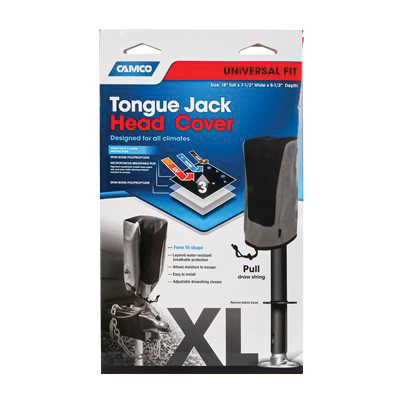 The Camco electric tongue jack cover helps protect your electric tongue jack when it is not in use and in storage. The durable three-layer spunbond polypropylene provides protection from harmful UV rays, excess moisture and dirt and debris. Tongue jack cover accommodates most styles and brands of electric tongue jacks and measures 18 in H x 7-1/2 in W x 8-1/2 in D.