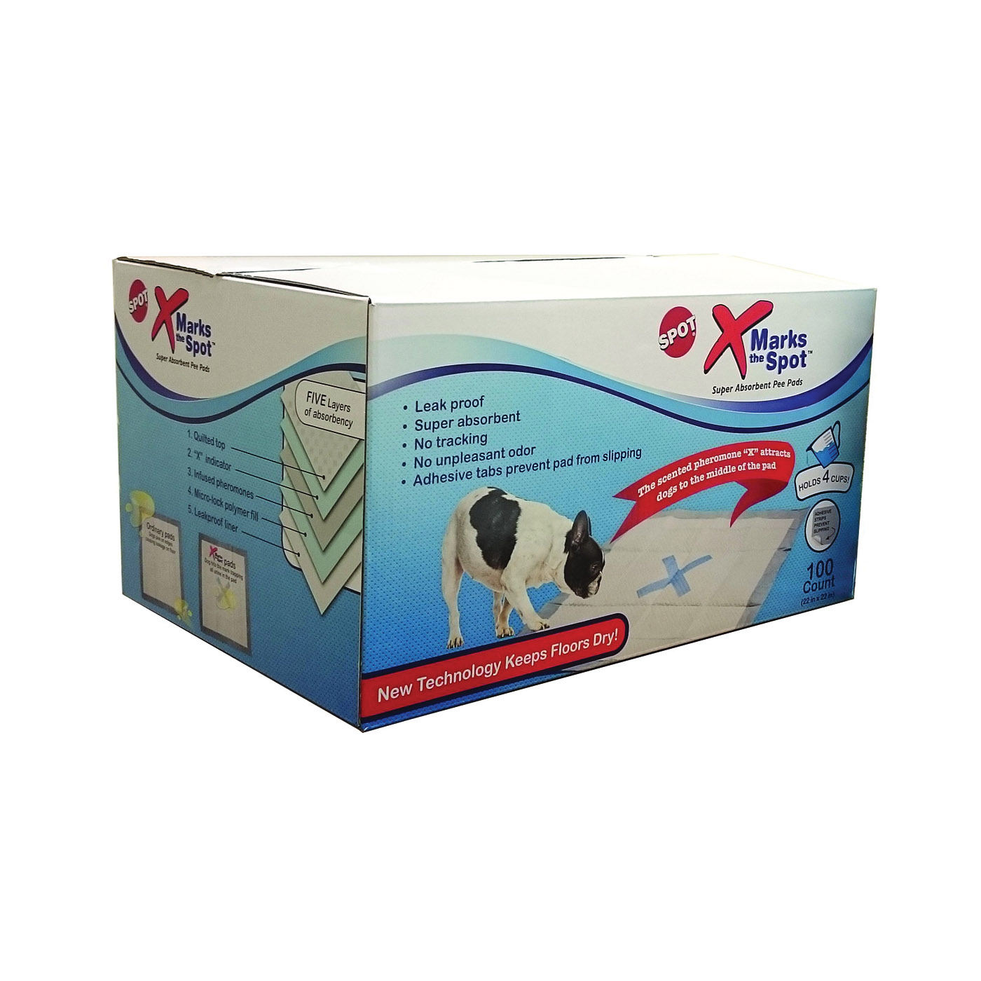 X marks the Spot super absorbent pee pads feature five layers of absorbency, holds up to four cups of liquid and includes adhesive strips to keep the pad firmly in place. Scented pheromone X attracts dogs to the center of the pad to prevent leaks.
