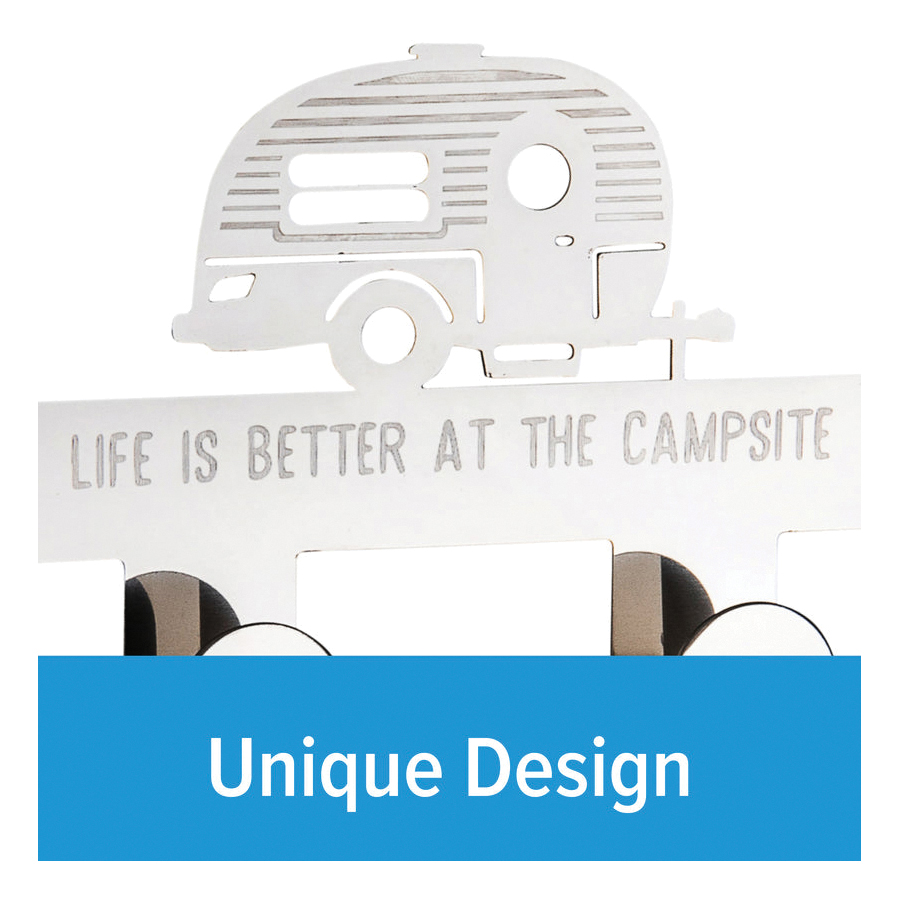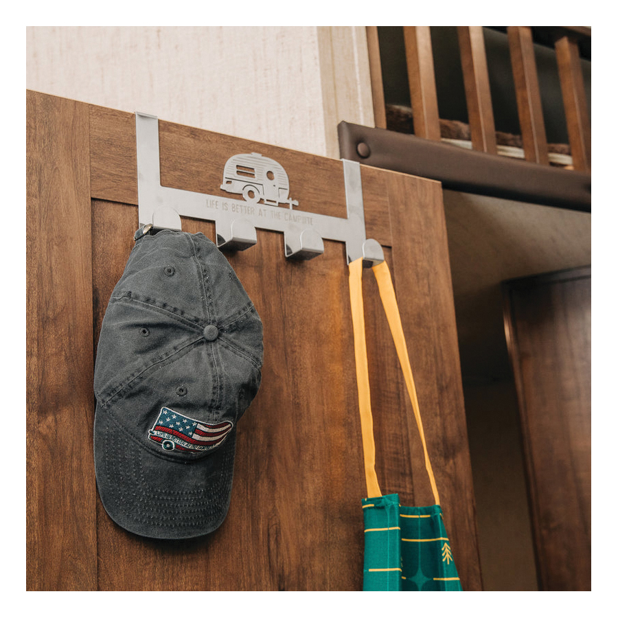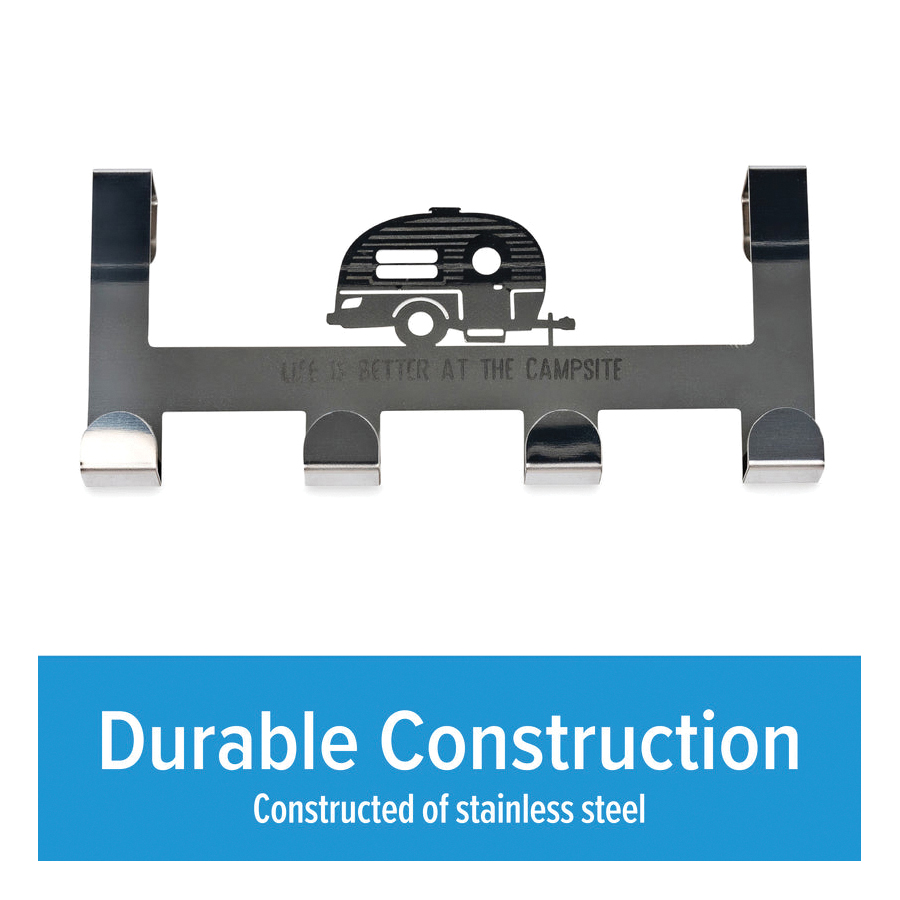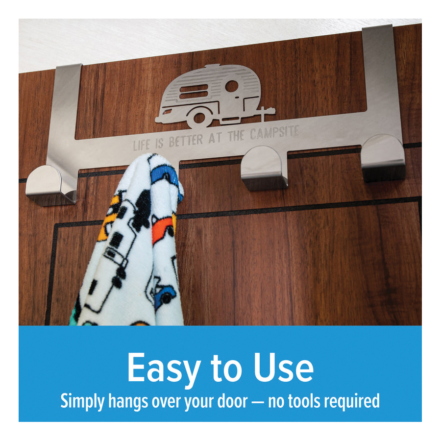 The Life is Better at the Campsite over the door towel hanger provides four hooks for hanging towels, bathrobes, jackets, hats, scarves, purses and more. It is an ideal solution for small places excellent for bedrooms, bathrooms and closets. The hanger fits standard interior doors up to 1-1/2 in thick. Easy to use, it simply hangs over your door - no tools required. Features a retro RV design with the phrase, "Life is Better at the Campsite". Measures 12-in L x 5-1/2 in W x 3 in D and is constructed of durable stainless steel.