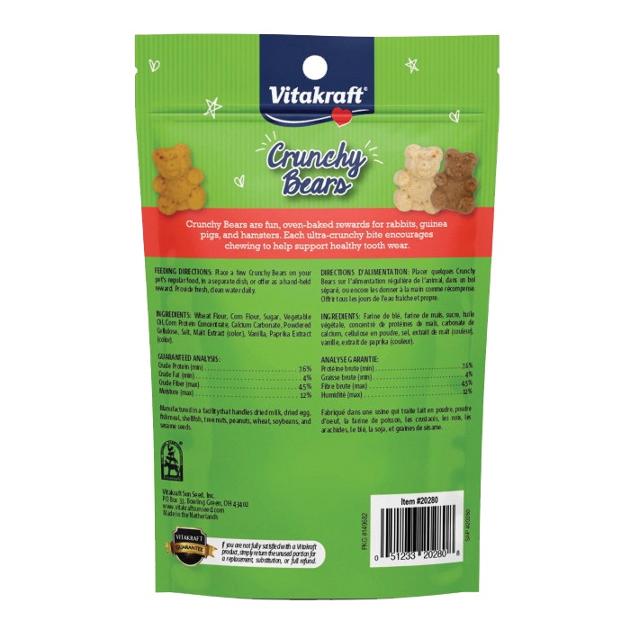 Crunchy Bears are fun, oven-baked rewards for rabbits, guinea pigs, hamsters and other small animals. Each ultra-crunchy bite is made without any artificial flavors or preservatives and helps encourage chewing to promote healthy tooth wear.