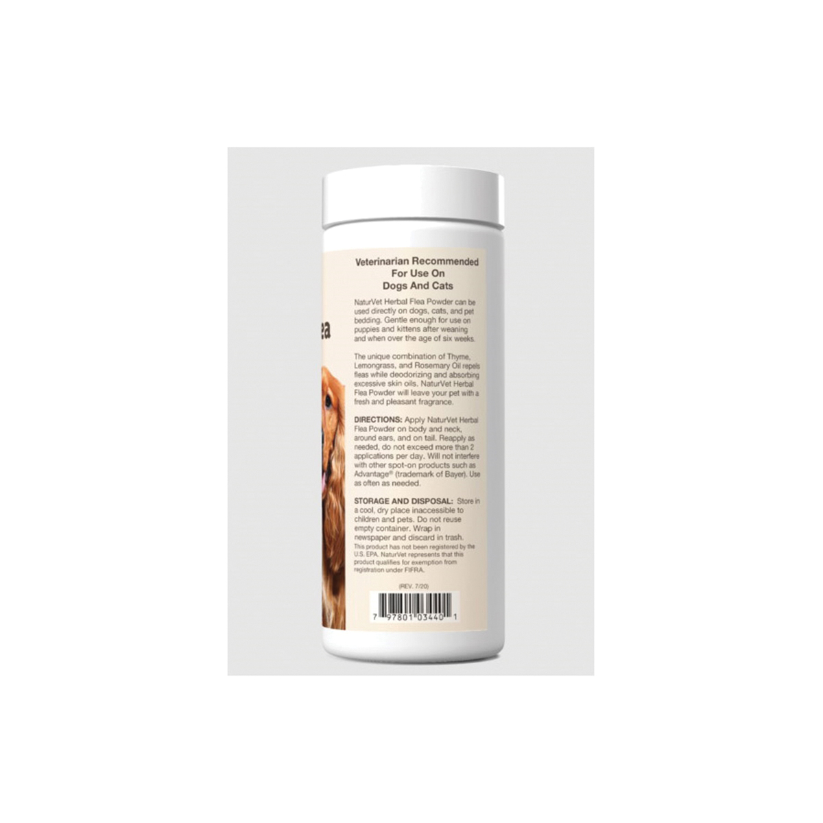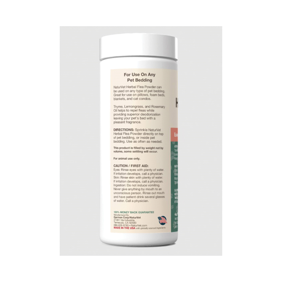Can be used directly on dogs, cats and pet bedding. Gentle enough for use on puppies and kittens after weaning and when over the age of six weeks. Natur-Vet herbal flea powder can be used directly on dogs and cats over the age of six weeks. The unique combination of natural thyme, lemongrass and rosemary oil repels fleas while deodorizing and absorbing excessive skin oils. Natur-Vet herbal flea powder will leave your pet with a fresh and pleasant fragrance. Natur-Vet herbal flea powder can be used on any type of pet bedding. Great for use on pillows, foam beds, blankets and cat condos. Thyme, lemongrass and rosemary oil helps to repel fleas while providing high-level deodorization leaving your pet's bed with a pleasant fragrance.