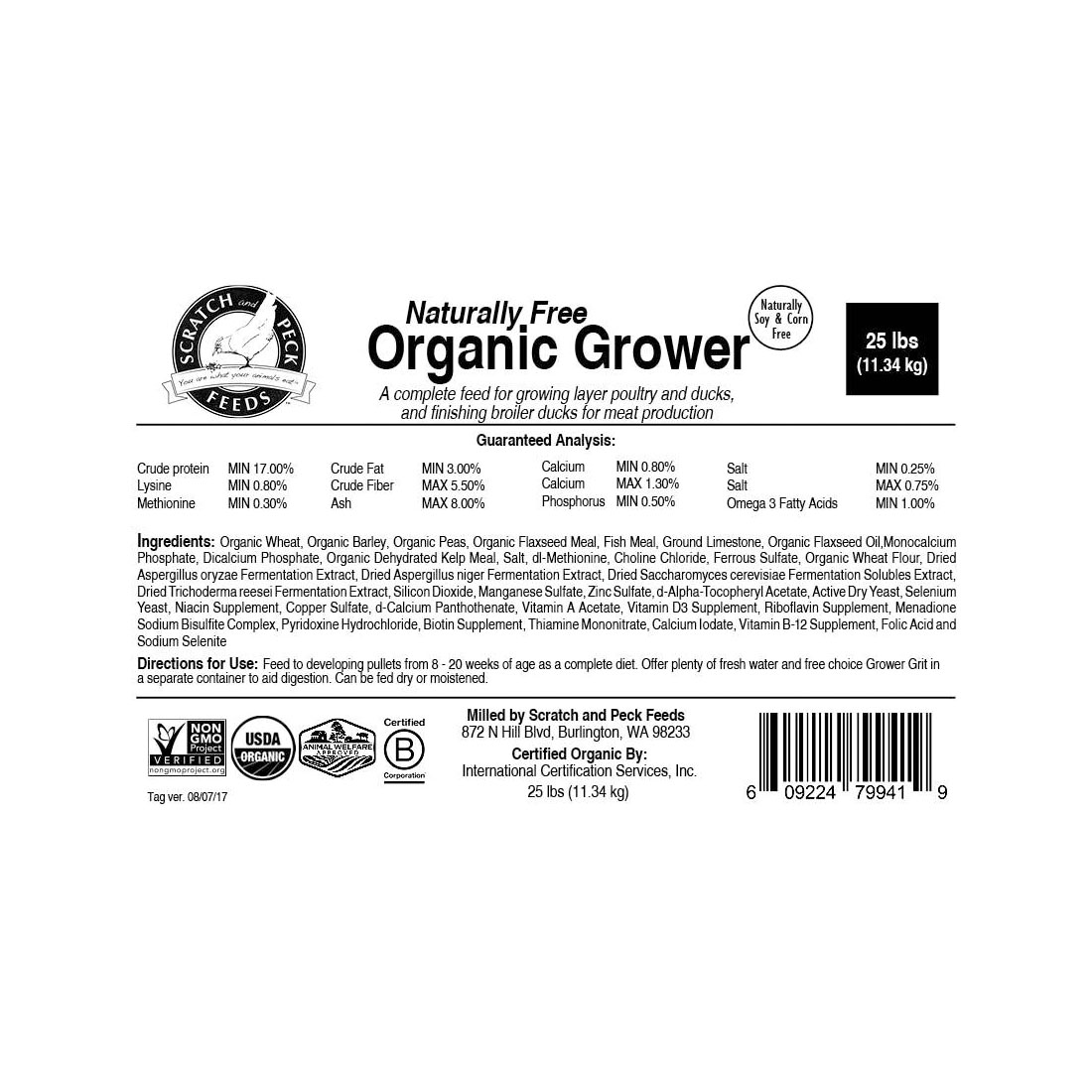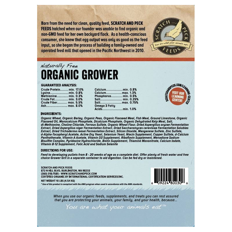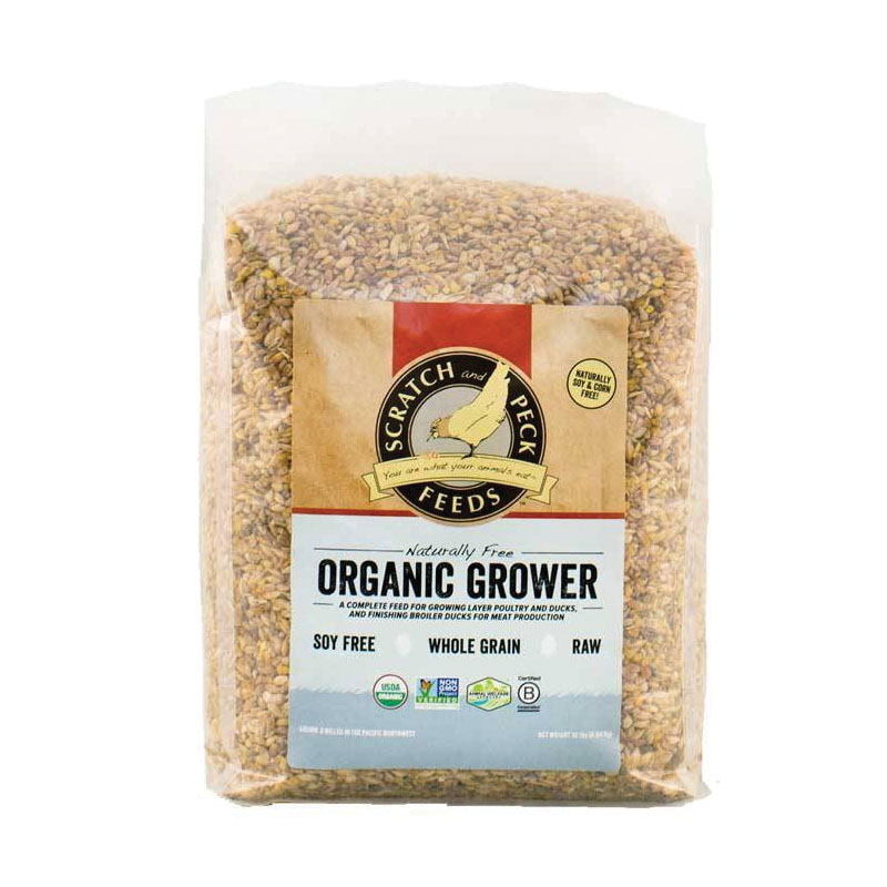 Naturally free organic grower is a non-GMO project verified and certified organic product for growing layer poultry and ducks and finishing broiler ducks. We use a blend of regional, organic whole grains grown by family farms. While all of our products are soy-free, our naturally free poultry feed line is both soy-free and corn-free. At 8 weeks of age, your chicks' growth rate will start to slow and they will be big enough to consume whole grains. This is the perfect time to begin transitioning your chickens to our naturally free organic grower. Don't worry about any left over naturally free organic starter, you can mix the two feeds together. Naturally free organic grower contains a similar mixture of organic ingredients to the naturally free organic starter feed but it contains less protein and the grains are left in their whole, natural state. We leave the grains whole because oxidation begins once a grain is cracked. Oxidation slowly diminishes nutritional value as the oil in the grain starts to turn rancid which shortens the shelf life and palatability of the grain.
