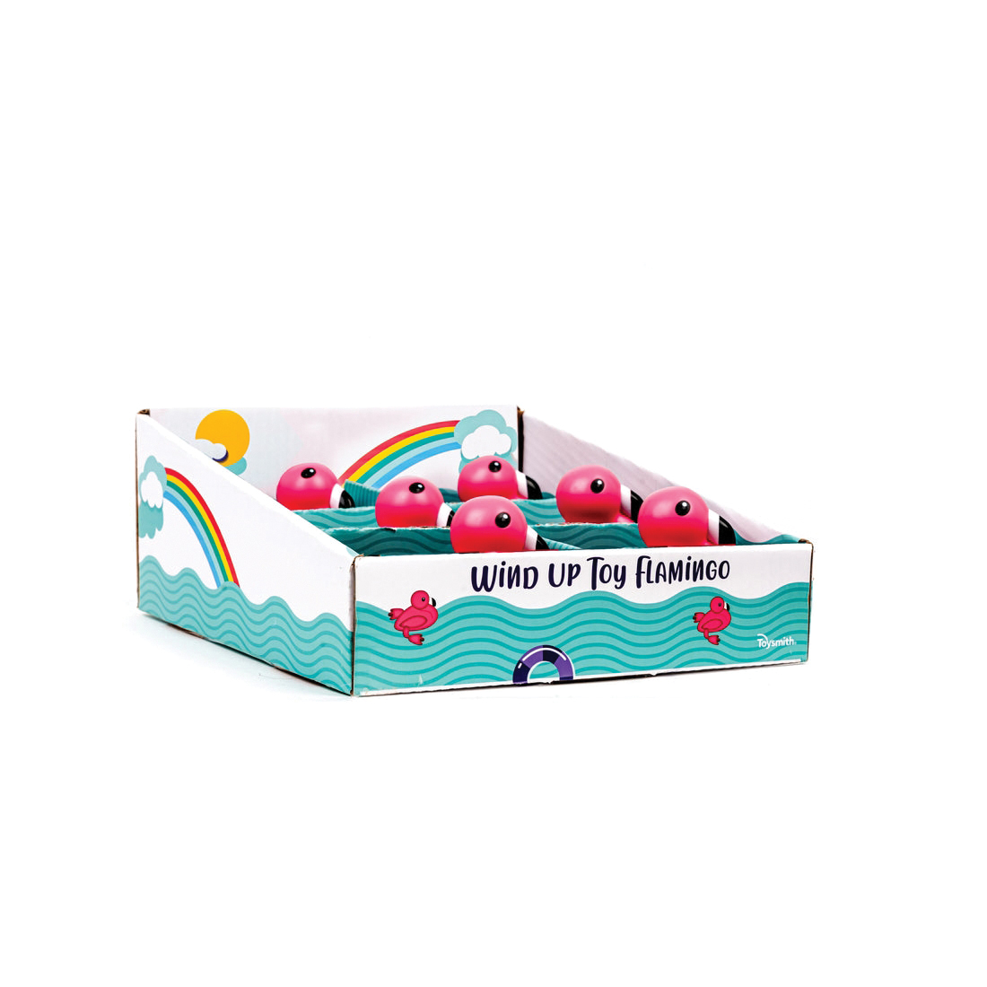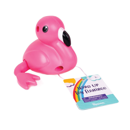 Make a splash with Toysmith's wind-up toy flamingo. Twist the wind-up mechanism on the belly of the flamingo and then place it right side up in the water and watch it swim around. The flamingo is made of plastic and is soft pink in color. Place it on a surface after winding and it will crawl across the ground. Also available in turtle, shark and duck. Collect them all and have them race.