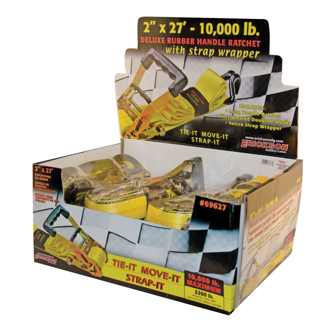 Erickson Strap with Deluxe Rubber Handle, Working Load Limit: 3300 lb, End Type: J-Hook, Adjustment Type: Ratchet, 27 ft L, 2 in W, Polyester, Yellow, Breaking Strength: 10,000 lb, Includes: (10) Ratchet Straps