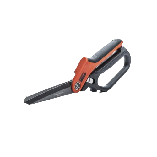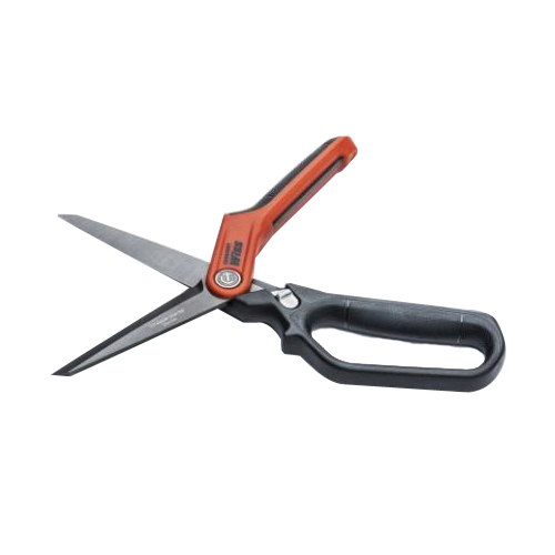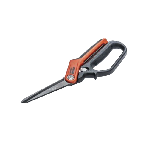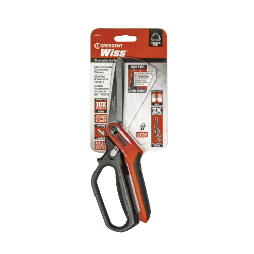 Crescent Wiss spring loaded tradesman shears feature premium steel blades that extend through the handles for twice the strength and ten times the cutting power of standard shears. Their titanium blade coating is three times harder than steel for extra durability and longer edge life. A serrated bottom blade grips material for better control and cleaner cuts, while spring loaded design and optimized handle contact points improve comfort and reduce fatigue. A quick-release ergonomic latch that locks the tool closed for storage and soft grip TPR handles are added safety and comfort features that make Crescent Wiss spring loaded tradesman shears best in class performers.