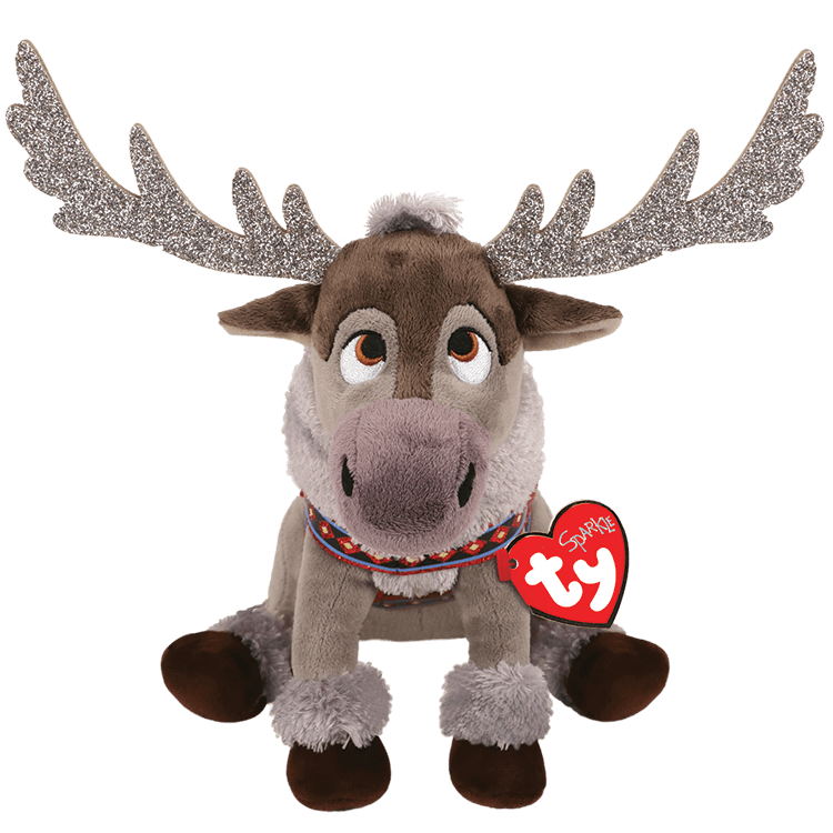 Sven is dressed up to pull Kristof's sled, he's wearing his harness in bright sparkly red. His antlers shimmer silvery bright, so you can see Sven even during the night. With his little brown hooves cuffed with soft silky fur, this little gray reindeer is a friend you'll prefer.