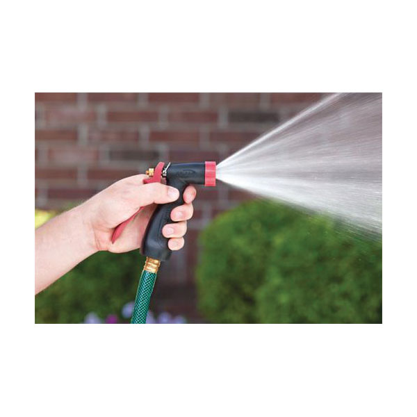 This contractor grade nozzle has an insulated rubber grip for spraying hot or cold water up to 160 deg F. It is fully adjustable and will spray from a light spray for small tasks to a powerful jet spray for heavy-duty jobs. There is a removable cap that covers a threaded tip for use with additional watering accessories. To modify water pressure, a flow control knob allows a quick adjustment to the flow of water without going back to the faucet. A simple flip of the triangle-clip holds the trigger in place, allowing continuous water flow which helps reduce hand fatigue.