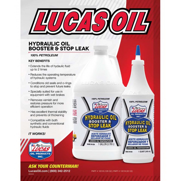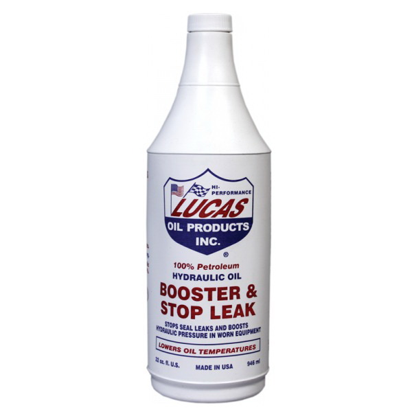 An additive for hydraulic systems that stops leaks and increases hydraulic pressure. Use in new units to stop initial wear and increase fluid life. Lucas hydraulic oil booster and stop leak was formulated to renew hydraulic fluid with an additive package that stops seal leaks, boosts pressure, reduces operating temperatures and increases the life of hoses, rams and cylinders. It is an inexpensive solution to most hydraulic problems and a perfect preventative maintenance product.