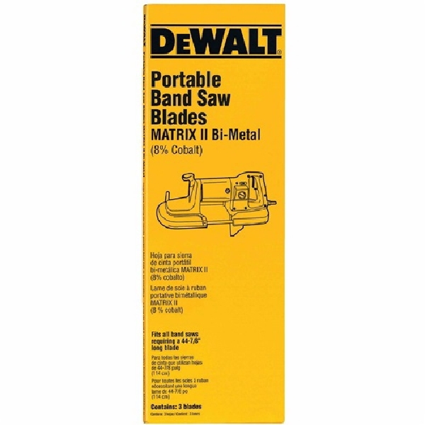 Packed with a Matrix II high-speed steel edge, 8% cobalt content and Arc 65-67 tooth hardness, DeWALT bi-metal portable band saw blades can stand up to extreme heat and wear. An alloy steel backer resists fatigue.