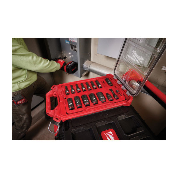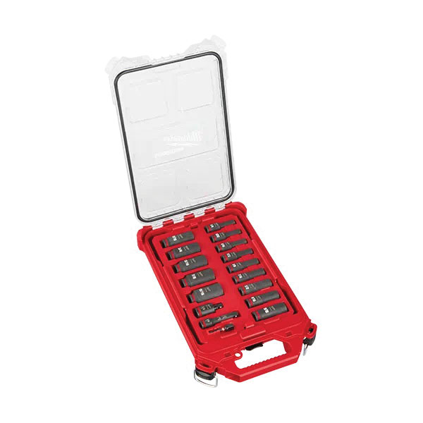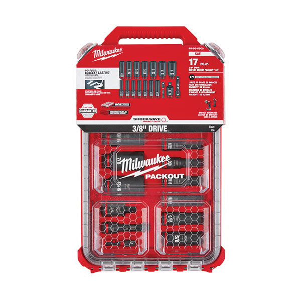 Our SHOCKWAVE Impact Duty™ socket set features the boldest, longest lasting markings and extreme impact durability in high-torque applications. The stamped and ink-filled size marking enables you to select the right socket every time throughout the life of the socket. Engineered with high-strength forged steel for optimized performance in heavy-duty applications. The non-slip hex geometry prevents fastener rounding. Our dual-hole design and ring groove allow for easy socket attachment and removal. Sets can be kept organized in the included PACKOUT™ compact low-profile organizer with a clear top for easy identification of parts at a glance. The low-profile organizer is part of our PACKOUT Modular Storage System, allowing for customization of storage systems to easily transport and organize tools and accessories. All SHOCKWAVE Impact Duty™ sockets and extensions are backed by our lifetime assurance and meet ASME industry standards.