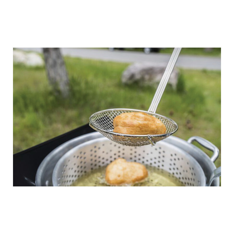 Next time you are frying your favorite foods, keep the oil clean with this long handled skimmer. The nickel-plated extended handle allows you to get the job done effectively from a safe distance.