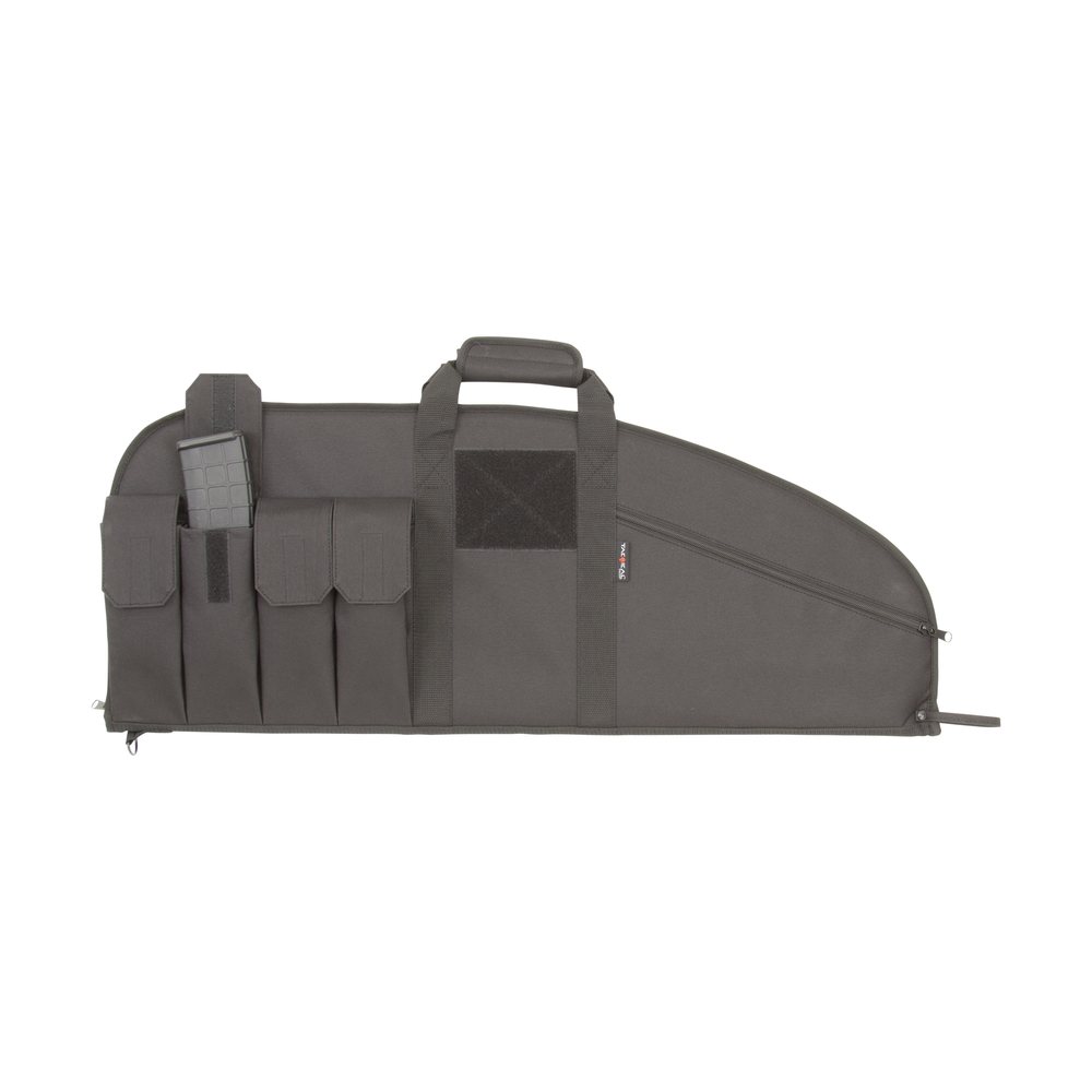 The combat tactical rifle case from Allen tactical fits tactical rifles with or without scopes. Features four magazine pockets with hook and loop closures, plus a large zippered accessory pocket that fits targets, gloves, ammo and other accessories. A large 5-1/4 in x 4-1/4 in hook and loop patch is perfect for adding morale and name patches. The exterior of the case is constructed from heavy-duty endura fabric and the inside of the case has a soft knit lining and thick foam padding to protect your firearm. Includes durable web handles with a padded handle grip. Lockable.
