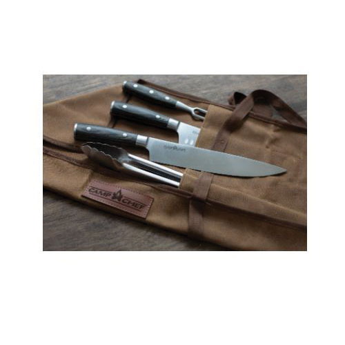 The 4 piece chef's set is the perfect carving station companion. Handpicked from chef's like you, we've equipped this set with the best tools. We've included all stainless steel tools like a 10 in chef knife, santoku knife, a pair of grill tongs, a handy carving fork and to wrap it all up a canvas roll knife case. Be sure to check out the Pakkawood handles we've incorporated. We think you'll find it to be a comfortable, natural grip with a clean finish. It's perfect for all types of uses! Enjoy in your outdoor kitchen, home kitchen, back patio or at the campsite.