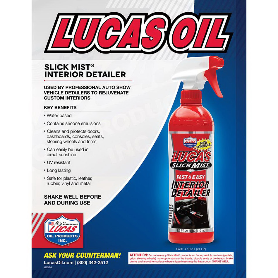 Lucas Slick Mist interior detailer is a spray treatment exclusively formulated by Lucas Oil Products designed to clean and protect like nothing you've ever used. Spray as needed onto interior surfaces such as plastic, vinyl, leather, rubber and metal for a "like-new" look. Cleans and protects, dashboards, consoles, doors and trim. Also works great on household furniture.