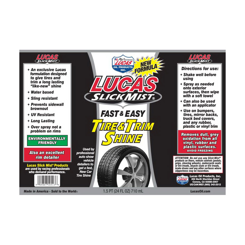 Lucas slick mist tire and trim shine is a treatment spray exclusively formulated by Lucas Oil Products designed to give Tires and Trim a long lasting "like-new" shine. Use slick mist tire shine to remove dull, gray oxidation from bumpers, tires, plastic or any rubber and vinyl trim.