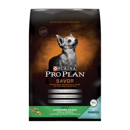 Pro Plan SAVOR Dog Food, Shredded, S Breed, Dry Form, Chicken, Rice Flavor, 6 lb Net Content, Ingredients: Chicken, Ground Rice, Poultry By-Product Meal (Source of Glucosamine), Soybean Meal, Beef Tallow Naturally Preserved with Mixed-Tocopherols, Corn Gluten Meal, Whole Grain Corn, Whole Grain Wheat, Corn Germ Meal, Dried Egg Product, Natural Liver Flavor, Brewers Dried Yeast, Glycerin, Wheat Bran, Mono and Dicalcium Phosphate, Fish Meal (Source of Glucosamine), Salt, Calcium Carbonate, Potassium Chloride, Vitamins (Vitamin E Supplement, Niacin (Vitamin B-3), Vitamin A Supplement, Calcium Pantothenate (Vitamin B-5), Thiamine Mononitrate (Vitamin B-1), Vitamin B-12 Supplement, Riboflavin Supplement (Vitamin B-2), Pyridoxine Hydrochloride (Vitamin B-6), Folic Acid (Vitamin B-9), Vitamin D-3 Supplement, Menadione Sodium Bisulfite Complex (Vitamin K), Biotin (Vitamin B-7)), Minerals (Zinc Proteinate, Manganese Proteinate, Ferrous Sulfate, Copper Proteinate, Calcium Iodate, Sodium Selenite), Choline Chloride, L-ascorbyl-2-polyphosphate (Vitamin C), Dried Bacillus Coagulans Fermentation Product, Garlic Oil, Nutritional Information: 29% Crude Protein, 17% Crude Fat, 3% Crude Fiber, 12% Moisture, 1.5% Linoleic Acid, 1% Calcium, 0.8% Phosphorus, 15000 IU/kg Vitamin A, 460 IU/kg Vitamin E, 70 mg/kg Ascorbic Acid, 440 ppm Glucosamine, 600 million CFU/lb Bacillus Coagulans Microorganisms