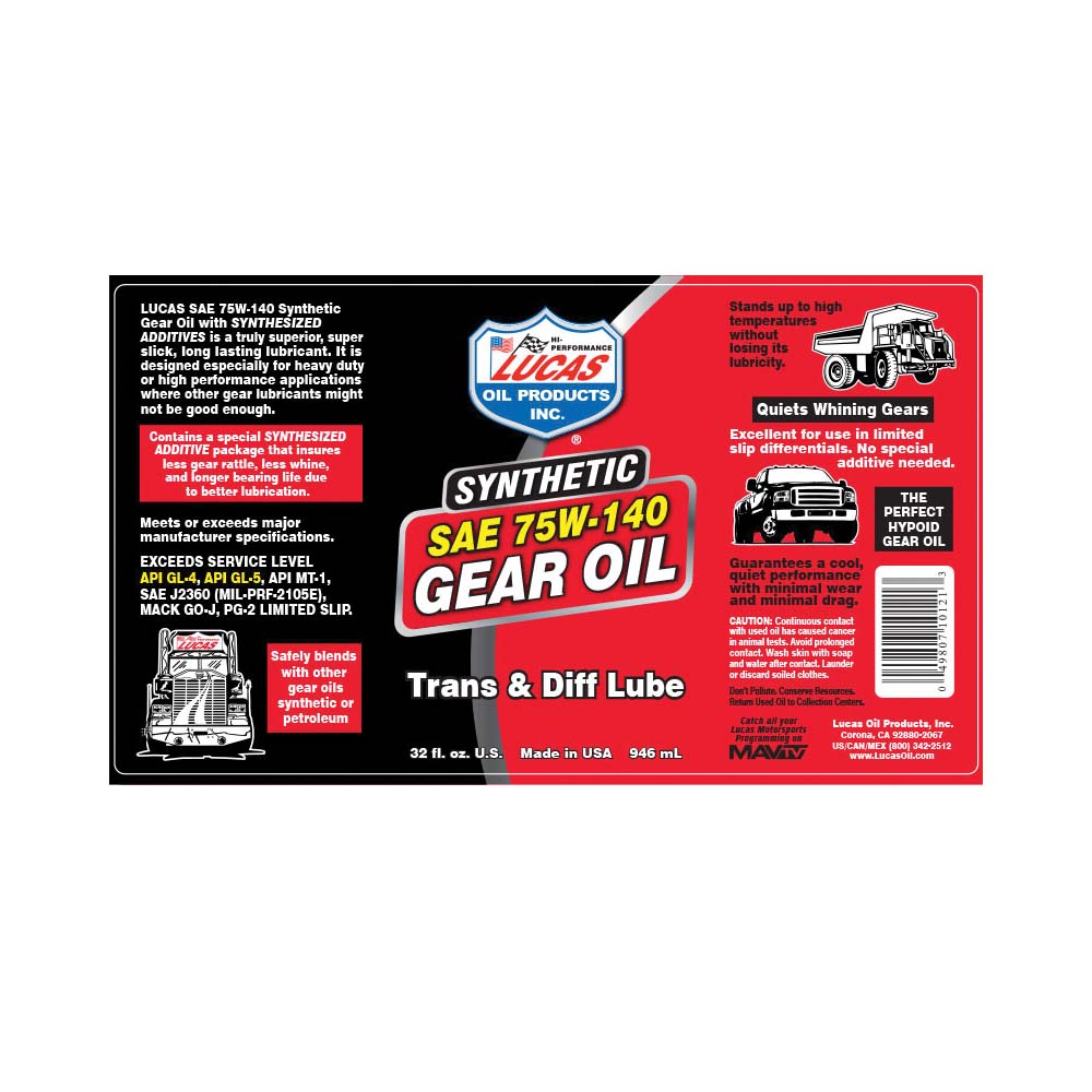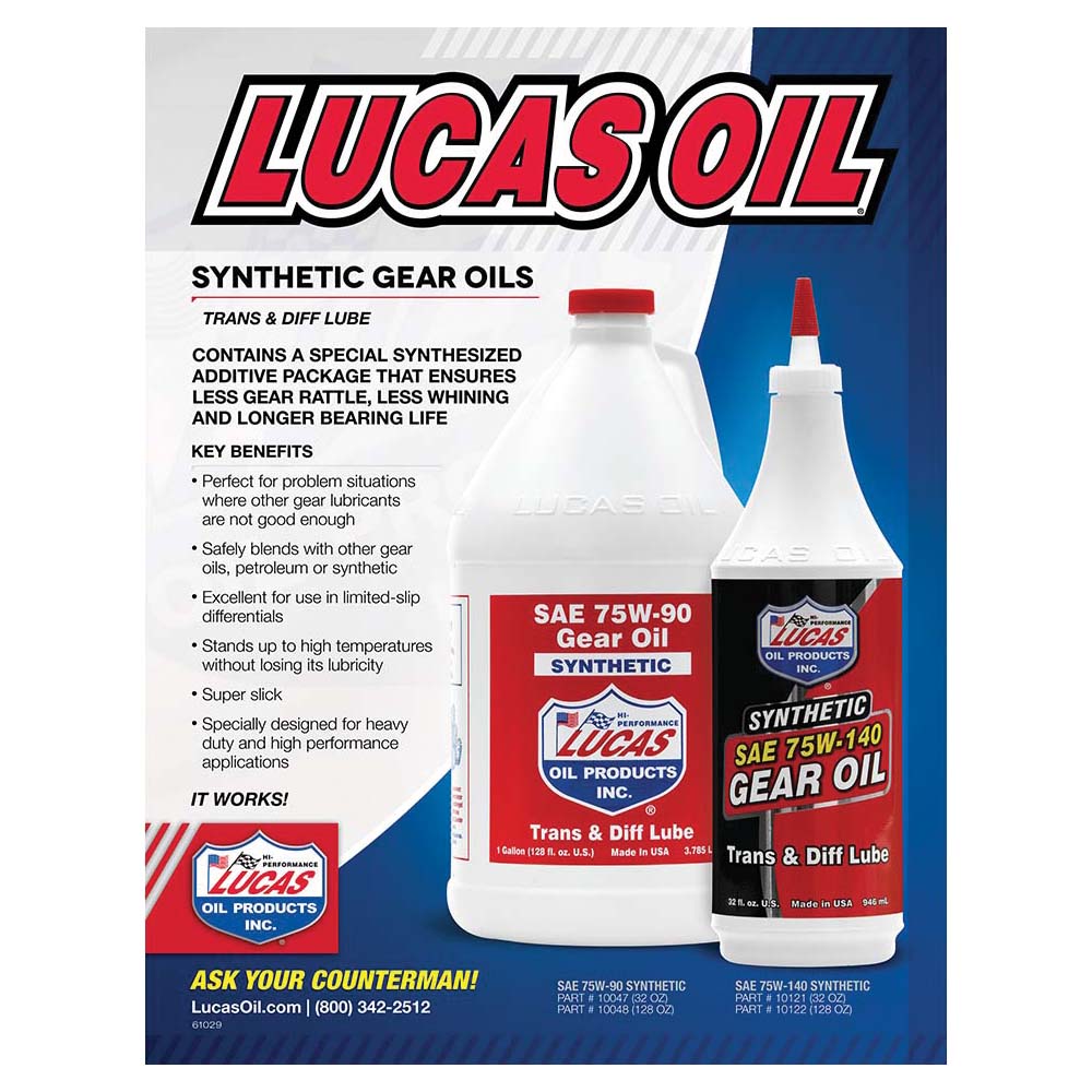 Lucas pure synthetic gear oils are super-slick, long lasting lubricants designed especially for heavy-duty or high-performance applications where regular gear lubricants just aren't good enough. They contain a special additive package that increases lubricity and insures less gear noise and longer bearing life. Designed to stand up to high-temperatures without losing its lubricity. Excellent for use in limited slip differentials.