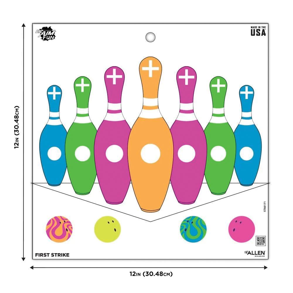 The EZ Aim® Fun Triggering More Fun Targets are part of the EZ Aim's Fun series, designed to make your shooting experience more fun and entertaining. Made with an abundance of color and designs, these shooting targets naturally bring smiles to target practice. Not only do they-grade high-in performance, but they-grade higher in fun. The EZ Aim Fun, Triggering More Fun Target assortment is geared for the handgun shooter that wants a change of pace from boring one color target faces. The full color aiming surfaces and unique target situations are a fresh approach to improving your skill. The pack includes three different shooting games, three Shooting darts targets, three 4X trainer targets and three first strike targets bringing a layer of fun to target practice. The shooting darts targets use a familiar dartboard layout to provide a different kind of challenge to the standard bullseye shape. 4X trainer targets have four individual targets on each sheet and provide coaching tips-based on the shots of impact. The first strike targets bring bowling into target practice, targets consist of bowling pins used as aiming points. These targets are excellent used for handgun target practice, but most styles lend themselves general to plinking fun. Pack contains nine paper shooting target, each measuring 12 in W x 12 in H (three styles per pack).