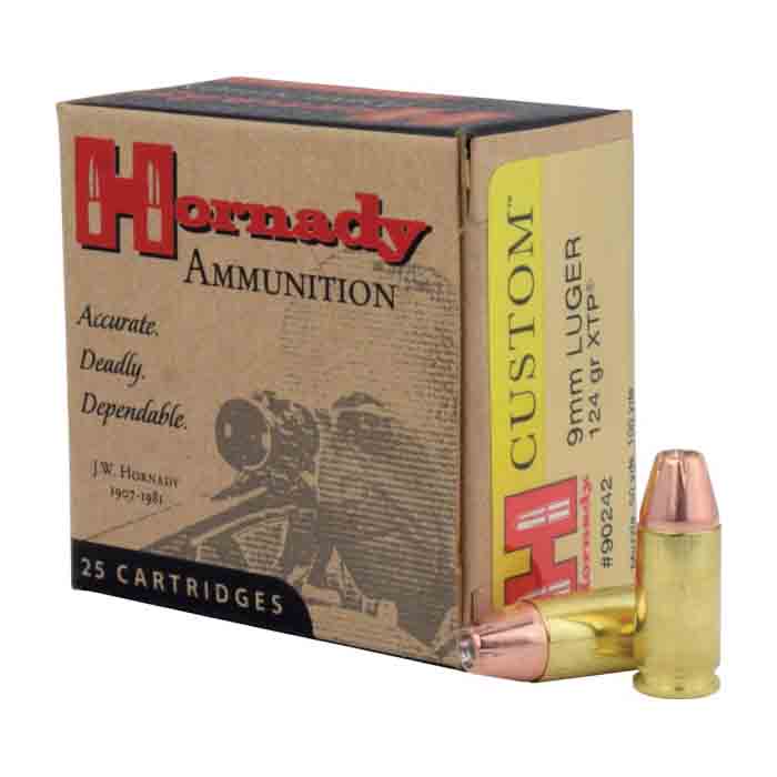 Handgun shooters looking for supreme accuracy and maximum knock down power have come to rely on Hornady® Custom pistol ammo, loaded with either the famous Hornady® XTP (Extreme Terminal Performance) bullet, our FMJ or FTX bullet. Every round of Hornady® Custom™ ammunition is hand inspected before packaging to ensure the highest levels of quality control. At Hornady,® we manufacture Custom™ ammunition to give shooters and hunters the advantage of hand-loaded accuracy in a factory load.
