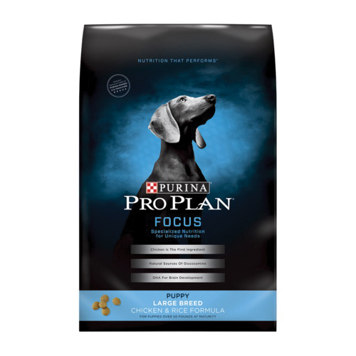 Purina Pro Plan FOCUS Dog Food, Breed Size: L, Dry, Flavor: Chicken, Rice, Net Content: 34 lb, Ingredients: Chicken, Brewers Rice, Corn Gluten Meal, Whole Grain Corn, Poultry By-Product Meal (Natural Source Of Glucosamine), Whole Grain Wheat, Animal Fat Preserved With Mixed-Tocopherols, Pea Fiber, Fish Meal (Natural Source Of Glucosamine), Dried Egg Product, Animal Digest, Fish Oil, Calcium Phosphate, Salt, Potassium Chloride, Calcium Carbonate, Potassium Citrate, L-Lysine Monohydrochloride, Choline Chloride, Zinc Sulfate, Vitamin E Supplement, Ferrous Sulfate, Manganese Sulfate, Niacin, Vitamin A Supplement, Copper Sulfate, Garlic Oil, Calcium Pantothenate, Pyridoxine Hydrochloride, Vitamin B-12 Supplement, Thiamine Mononitrate, Riboflavin Supplement, Calcium Iodate, Vitamin D-3 Supplement, Menadione Sodium Bisulfite Complex (Source Of Vitamin K Activity), Folic Acid, Biotin, Sodium Selenite, Nutritional Information: 28% Crude Protein, 13% Crude Fat, 6% Crude Fiber, 12% Moisture, 1.6% Linoleic Acid, 1.1% Calcium, 0.8% Phosphorus, 0.30 mg/kg Selenium, 15,000 IU/kg Vitamin A, 100 IU/kg Vitamin E, 0.05% Docosahexaenoic Acid, 500 ppm Glucosamine